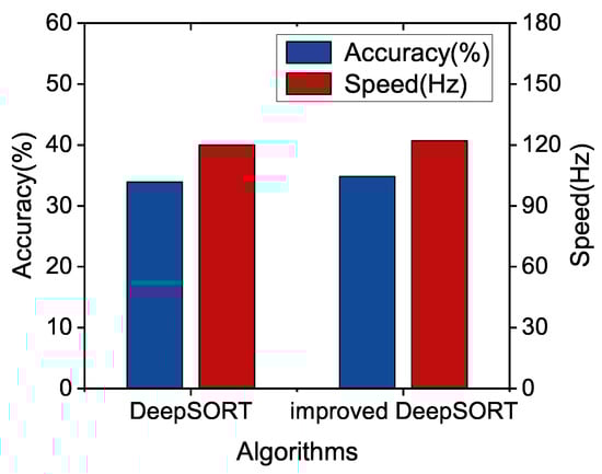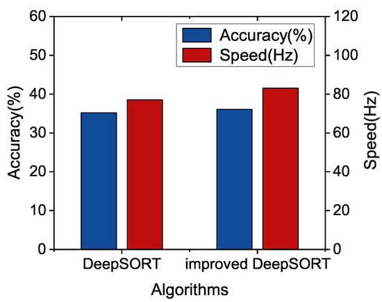 The tracking results are further presented in Figure 7. We take multi-object tracking accuracy (MOTA) and running speed as evaluation indicators. We can see that the improved DeepSORT shows better performance in both speed and accuracy.