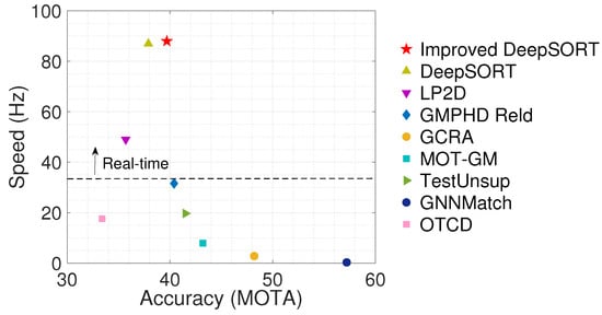 In addition, we compared the accuracy and speed of improved DeepSORT with several advanced methods, as shown in Figure 11. The results indicate that the improved DeepSORT method can obtain better accuracy results at a higher speed compared with the other tracking methods. Algorithms with higher accuracy than our method are far slower in speed and cannot reach real-time. In addition, the algorithm that is faster than the proposed algorithm is far less accurate. Our algorithm achieves a balance between accuracy and speed. Therefore, we can conclude that when the detection quality is appropriate, the algorithm proposed in this paper is more effective than DeepSORT.