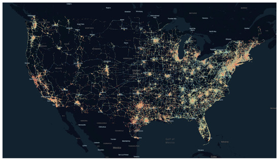 An alternative to dedicated equipment is to crowdsource connected vehicle data with enhanced attributes. Original Equipment Manufacturers (OEM) integrate enhanced sensors, accelerometers, and cellular connections into production vehicles to provide a rich data source on current road conditions. Integrating and utilizing the enhanced vehicle data have provided agencies with pavement marking evaluations, lane widths, traffic signal performance, and crash mitigation through surrogate safety measures and hard braking [25,26,27,28,29,30]. A recent invention leverages individual wheel speed via rotational sensors in combination with drivetrain information to provide pavement quality information in production vehicles [31]. This information can estimate International Roughness Index (IRI) values from a fleet of crowdsourced vehicles. Figure 1 below shows the connected vehicle coverage across the US using anonymized, enhanced production vehicle data for pavement quality evaluation in May of 2022.