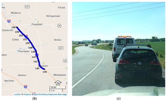 Data collection route and equipment; (a) data collection convoy—lead: inertial profiler, second: production vehicle, final: safety vehicle with hazard lights; (b) Indiana I-65 from reference marker 138 to 158; (c) data collection convoy.