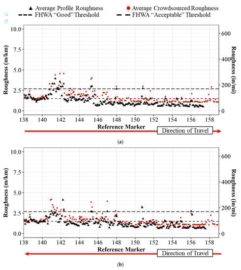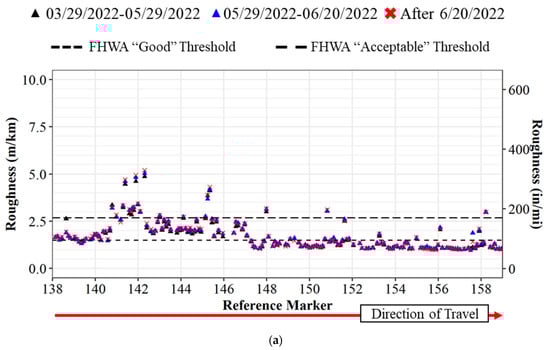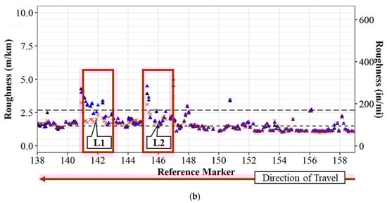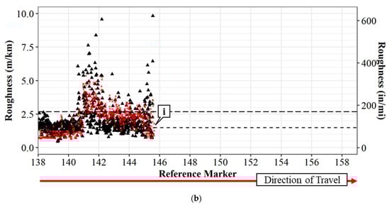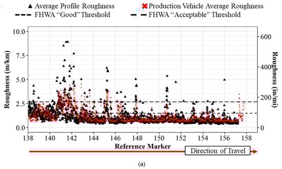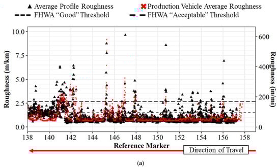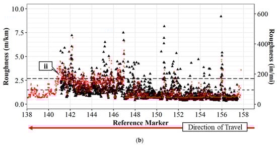 The raw roughness values for Interstate 65 northbound can be seen in Figure 5 below, where the profiler values are in black, and the production vehicle values are red. The horizontal axis shows the reference marker on the interstate, and the vertical axis shows the IRI roughness. There are also two horizontal dotted lines at 1.49 m/km (95 in/mi) and 2.68 m/km (170 in/mi). These lines represent the national standard in the US for IRI thresholds. IRI values less than 1.49 m/km (95 in/mi) are classified as “good” road segments, whereas values below 2.68 m/km (170 in/mi) are “acceptable” road segments [36]. Values above 2.68 m/km (170 in/mi) surpass the threshold and require strategic repairs, maintenance, and rehabilitation. These thresholds set by the Federal Highway Administration (FHWA) also align with rider comfort [37]. Figure 5a shows the roughness values for the left lane and Figure 5b shows the roughness values for the right lane. At callout i in Figure 5b, the data collection was discontinued for both vehicles due to congestion on the roadway leading to speeds less than 24 kph (15 mph), which is below the operating threshold for the inertial profiler. Due to the difficulty in scheduling the inertial profiler, as the vehicle collects a large quantity of pavement evaluation for the state of Indiana, the team was not able to repeat the data collection. A similar comparison can be seen for Figure 6 in the southbound direction. Callout ii in Figure 6b refers to the point where the profile data is suspended due to file-size limitations. At a glance, the trend between the standard profiler values and the production readings are quite comparable at the same point in the roadway. The raw data from the production vehicle mapped to the inertial profiler data with a linear regression R2 value of 0.7493 on 6278 data points and a p-value < 0.001. These results suggest good agreement between the IRI and the inertial profiler IRI.