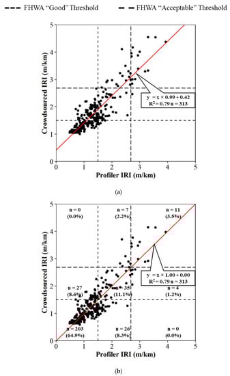 Linear correlation of profile IRI and crowdsourced IRI: (a) original data; (b) transformed crowdsourced data.