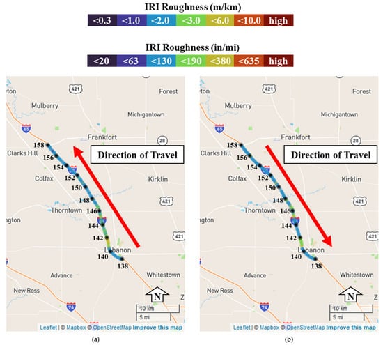 Spatial crowdsourced pavement roughness for I-65: (a) I-65 northbound; (b) I-65 southbound.