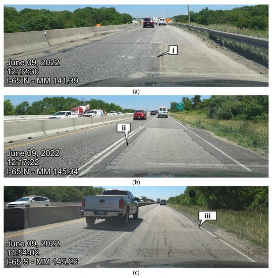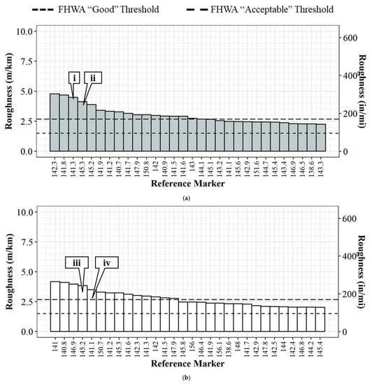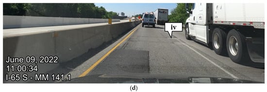 Crowdsourced data for the 32 km (20 mi) of the interstate provides agencies with an efficient tool for determining where there is poor road quality in that section. Using this data, an agency can pareto-sort the average roughness by 0.16 km (0.1 mi) segments to determine segments that need maintenance the most. Figure 10a below shows the 30 highest roughness values pareto-sorted (rank order) on Interstate 65 northbound. It can be quickly noted that reference markers 142.3, 141.8, 141.3, 145.2, and 141.9 have the highest roughness values in the northbound direction. Callouts i and ii can be seen qualitatively in Figure 11a,b, respectively. Figure 10b shows a pareto-sorted graph for the five segments with the highest roughness are 141.0, 140.8, 146.9, 145.2, and 141.1 for Interstate 65 in the southbound direction. Figure 11c,d are representative images of callouts iii and iv, respectively.