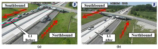 Another advantage to the crowdsourced data is that it would provide agencies with a way to track pavement deterioration over time. Figure 12 is an example of pavement roughness before a complete reconstruction of the pavement and after traffic is moved to the new pavement in the southbound direction on 20 June 2022. It can be noted that there is almost no change in the roughness for the northbound traffic (Figure 12a) as there is no change in traffic patterns. For the southbound direction, there is a change in roughness after 20 June 2022. Traffic is moved to the new pavement and the roughness decreases. Due to the aggregation of the crowdsource data, the roughness for each segment is a 60-day rolling average, and any previous measurements would require 60 days to clear out. The transition from old to new pavement can be verified using Indiana Department of Transportation traffic cameras at callouts L1 and L2 in Figure 13 below.