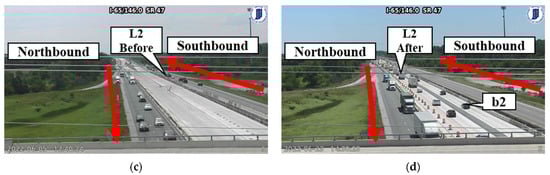 Figure 13a shows location L1 from Figure 12b. This camera is at reference marker 142 and the image was taken on 12 June 2022. It can be noticed that the northbound traffic is operating in the far rightmost lanes and the southbound traffic is operating in the leftmost lanes. Figure 13b shows the same location on 23 June 2022, where the southbound traffic is now operating in the middle two lanes of newly constructed pavement. Figure 13c is at reference marker 146 (callout L2 in Figure 12b) and the camera is facing the opposite direction from Figure 13a,b. In this image, the northbound traffic is operating in the two leftmost lanes and the southbound traffic is operating in the rightmost lanes on 5 June 2022. Figure 13d shows the southbound traffic operating on the new pavement in the center two lanes on 23 June 2022.
