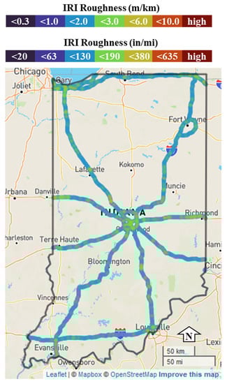 The United States has over 266.9 million automobiles and trucks, and over 14.2 million lane-kilometers (8.8 million lane-miles) nationwide that require preservation [1]. In 2019, federal spending for highways was $46 billion. The recent highway bill allocates $110 billion in additional funding for road and bridge repair [2,3]. With over six million kilometers (four million miles) of roads in the United States, it is a difficult task to prioritize road segments and allocate resources targeting the segments that need repair the most [4,5,6]. Current methods for evaluating road quality involve performing inspection with specialized equipment to assess pavement condition and ride quality [7,8,9,10,11]. Some studies have used image processing techniques to estimate IRI and detect potholes [12,13,14,15,16,17]. Recent initiatives use LiDAR for pavement inspection because it can provide additional information on roadway drainage, pavement markings, and lane widths [18,19,20,21,22,23,24]. The limitations of these methods are that they often require instrumentation of a dedicated vehicle and an employee to drive the road network.