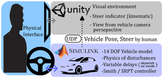 A real-time driver-in-the-loop simulation test platform is developed using MATLAB Simulink + Unity3D to emulate the network delayed vehicle teleoperation system, as shown in Figure 1. The human operator generates steer commands using the Logitech G920 steering wheel, which is connected to Simulink and as well as to Unity. The Simulink output is connected to Unity to provide visual feedback through monitors. The data flow, respective to different teleoperation modes, is mentioned in Section 2.2.