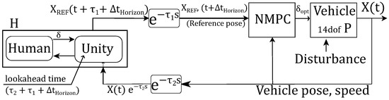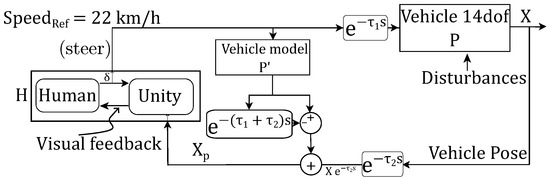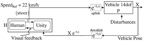For this mode, delays () are zero. Relating mode schematic (Figure 3) with simulation infrastructure (Figure 1), the Simulink 14-dof vehicle model receives the steer from the steering joystick and outputs the vehicle position to the Unity visual interface through UDP packets. A PI cruise control placed just before the 14-dof vehicle model maintains the vehicle speed near the reference speed (22 km/h).