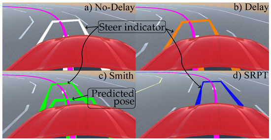 A problem with the previous delay-mode is that the steer indicator is respective to the delayed vehicle pose. To rectify it, Smith mode predicts the undelayed vehicle pose (). Consequently, the steer indicator is overlayed relative to the predicted vehicle pose (Figure 5c) instead of to the delayed vehicle pose.