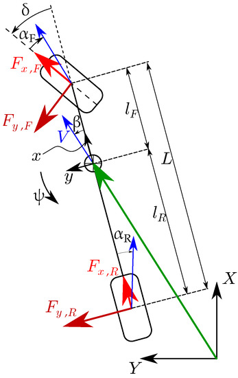 Accounted longitudinal forces (Equation (9)) consist of inertial force, rolling force, and aerodynamic force. During acceleration, a major part of the traction is provided by the front axle due to the front-wheel-drive (FWD) vehicle. During deceleration, the braking force is divided among the axles as per the braking bias distribution. For simplicity, longitudinal dynamics without relaxation length phenomenon is considered and thus given by
