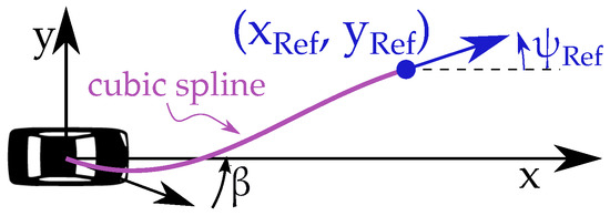 NMPC objective function: The aim is to keep the vehicle motion along with the received successive reference poses. The clothoid path is a preferred path in the vehicle motion because it resembles natural driving where steer changes linearly. Eliou and Kaliabetsos [27] suggest that cubic spline can be a first approximation for the clothoid curve. Each received reference pose (Figure 7), which is in the global reference frame, is transformed into the vehicle reference frame , on which a local cubic spline is estimated (Equation (15), Figure 9, [23]). The spline maintains continuity at both ends, i.e., starting tail with and end tail with . Note that spline coefficients update before every prediction horizon: