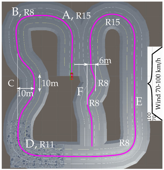 A test track of 438 m length is created in the Unity3D environment, as shown in Figure 11. It has six interesting regions, namely A–F.
