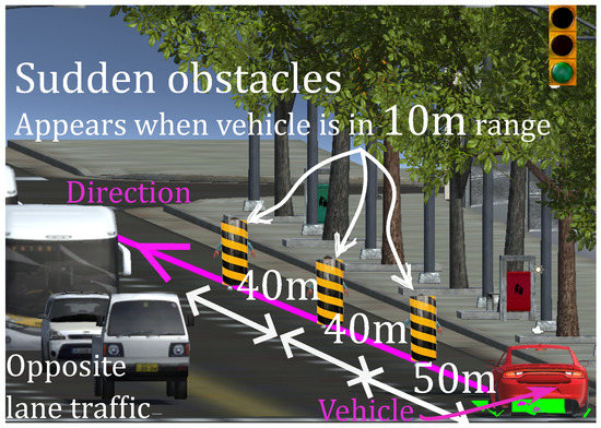 A snapshot of the visual driving interface is shown in Figure 10. It displays the first-person view that is captured from a camera placed on the vehicle roof in the Unity environment and some other useful information too. The camera has a horizontal and vertical field of view (FOV) of and respectively. The main vehicle model consists of a 14-dof vehicle model and Pacejka tire model with parameters of a passenger vehicle. The powertrain is customized to be treated like an electric motor vehicle. The simulation runs using ODE4 solver with a fixed time step of 1 ms. The Simulink ‘simulation pace block’with sync sample time of 10 ms is included to slow down the simulation to real time. This simulation platform is not set for distributed simulation. Instead, both the driver side and the vehicle side are simulated in the same Simulink model on one computer, and signals are transmitted internally without a physical communication network. Therefore, simulated delays, either constant or varying, are added optionally to simulate a teleoperated vehicle system with the delays of interest as discussed in Section 2.1.