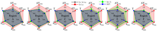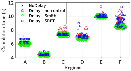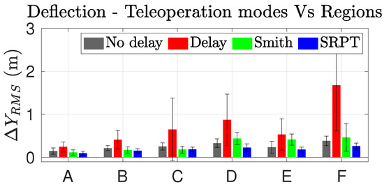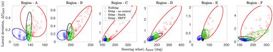 Red points which represent ‘Delay + no control’ mode show poor performance. This is anticipated in a teleoperated driving activity with delays as overactuation in the form of oversteering and repeated corrections [32]. ‘NoDelay’ mode shows better performance, which is expected, as the delays are absent. ‘Delay + Smith control’ lying between the ‘NoDelay’ and ‘Delay + no control’ mode, shows significant performance improvement. The ‘Delay + SRPT’ mode shows the best performance, compared to all modes. A similar trend and performance improvement with the ‘Delay + SRPT’ mode are observed in all of the regions of the track. Lateral deviation is always significantly reduced, with a decrement in steer effort too, especially in regions D-E-F, which are relatively aggressive maneuvers.