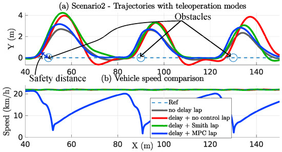 Predictive display and waypoint-based vehicle teleoperation are the two major categories in the literature. In human-in-the-loop experiments, predictive displays have been shown to be effective in compensating delays and improving vehicle maneuverability [10,11,12,13,14,15,16,17]. To estimate the vehicle position, it takes into account the delay in the control loop as well as the driving commands issued by the human operator. One way to convey the predicted position of the vehicle to a human operator is by displaying a “third-person view” of the expected position [14]. The prediction model can either be model-based [13], model-free [15], or a blend of both [16]. A vehicle model is necessary to forecast the vehicle response in model-based predictors, and the prediction accuracy is dependent on the vehicle model’s correctness. Prediction accuracy deteriorates in the presence of unforeseen disturbances in the driving environment, such as a low-adhesion road or a cross wind. In the model-free approach [15], delayed state dynamics received from the vehicle are used to make the prediction. It suffers from an another delay due to the convergence time involved in the state prediction. The blending of both approaches results slightly improved operation. Alonzo Kelly et al. [17] estimated the vehicle predicted position based on a velocity-driven non-linear vector differential equation assuming con. Even though it makes no attempt to simulate the forces of ground contact and traction, it has shown to be more than adequate for replicating the network delays of less than a second. Smit Saparia et al. [18] introduced an active safety system for collision avoidance in vehicle teleoperation. It receives the usual steering and reference velocity commands from the control station, but modulates them as per the potential fields of the obstacles. Sterling J. Anderson et al. [19] also retained steer-based driving in vehicle teleoperation. Their approach relies on path homotopies identification, which satisfy a set of position constraints, bounding a heuristically optimal or driver-preferred set of collision-free paths. The control authority of vehicle steer is allocated between the driver and obstacle collision threat minimization by a means weighted average. Vehicle steer is transmitted to the driver using visual or steering torque feedback to inform him/her about the predicted and action already being taken by the vehicle. However, this approach attaches an additional safety layer, and the robustness of teleoperation under the presence of delay is not discussed. In brief, predictive displays attempt to counter the time delay in loops by anticipating states using delayed states as input. This is useful for human-in-loop teleoperation, as it allows the human operator to not have to wait for the feedback and provides the sense of controlling the vehicle in real time. The drawback is that when prediction accuracy declines, the chances of asynchrony rise.