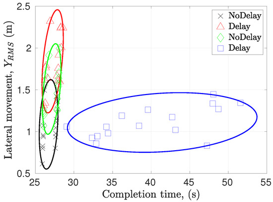 Figure 20 shows 17 data points for each mode, which belong to 17 full runs performed by all driver for each mode. Again, lateral movement corresponds to the distance from the straight center line, and completion time corresponds to the time taken to traverse the 150 m path with 3 obstacles. The no-delay data points show the best performance, as they carry less lateral movement and less completion time. Keeping safety the priority, the SRPT mode outputs comparable lateral movement at the cost of increment in completion time, while the rest of the modes show increments in the lateral movement, indicating risk in entering in the opposite lane and less controllability.