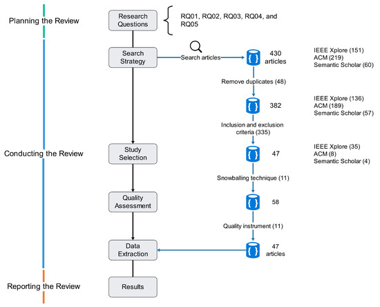 They established that the primary study is accepted only if the score is equals to 1; otherwise, it will be rejected. Table A1 presents the quality instrument and its results. As can be seen in Figure 1, 430 articles were found after performing the search. Of them, 48 duplicates were removed, for a total of 382. Then, 335 were removed because they did not meet the inclusion and exclusion criteria, for a total of 47. After that, 11 articles obtained on the snowballing technique were added, for a total of 58. Finally, 11 articles were removed because they did not fulfill the quality criterion. Thus, the selected articles reached 47. Table A2 presents the selected primary studies.