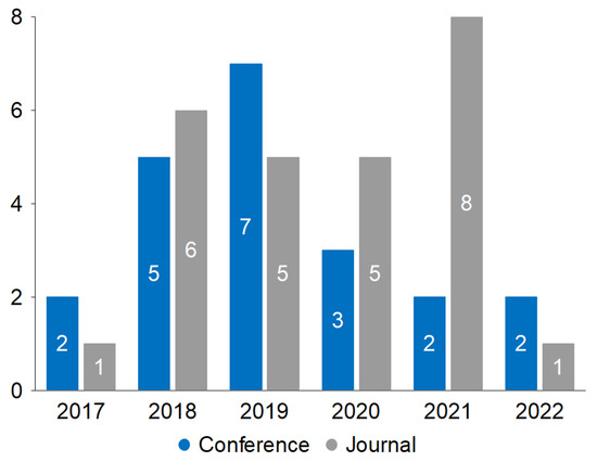 Of 47 primary studies, 21 are from conferences, and 26 are from journals. The two years when more studies have been published are 2018 and 2019. Figure 2 shows the number of studies and types published by year.