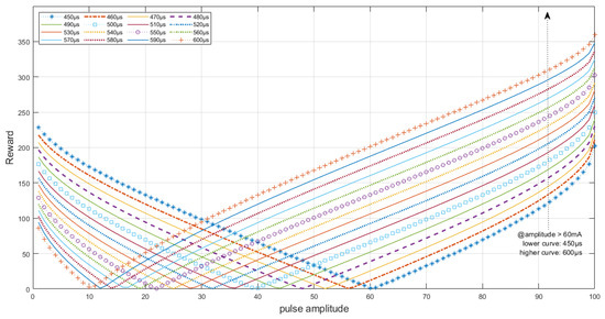 Reward curves relating amplitude and pulse width prioritization. At lower amplitudes, narrower pulse widths return higher rewards as it is preferable to decrease the stimulation cost; at higher amplitudes, the agent is expected to perceive greater rewards as the pulse width increases. The reward must also be related to the average cadence error, however.