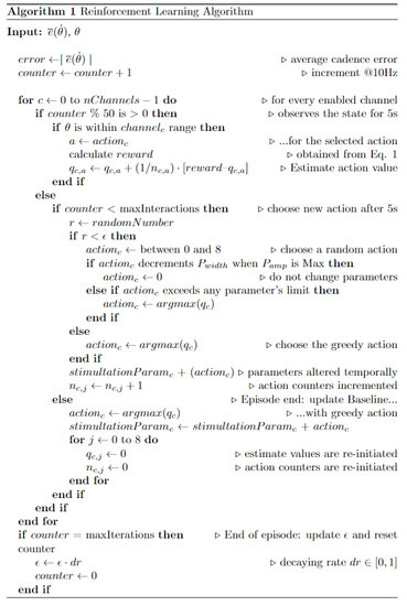 - The algorithm features a set of rules to which the agent must obey when choosing actions. In this case, limiting values have been set for each of the parameters and was defined in the firmware. For example, for the pulse width starting from the baseline at and throughout the cycling session, if the default limiting for the width parameter was set to + and −, any chosen action that exceeds or is below would be refused, and the agent would have to choose another one. It is important to emphasize that this whole procedure is performed by the agent for each channel independently and at every time step.