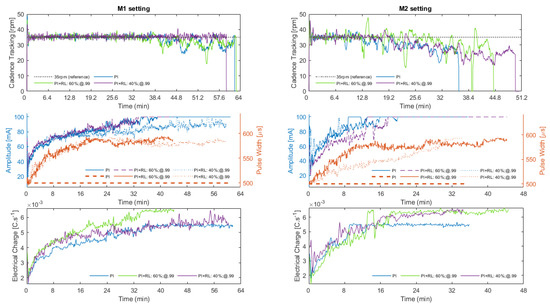 Figure 4 shows the algorithm performance obtained during the six different sessions, divided into M1 (left plots) and M2 (right plots) gear ratio settings. The subplots are divided into: (1) cadence tracking; (2) the sum of the instantaneous amplitude and pulse width of the six stimulation channels; (3) the sum of the injected electrical charge of the six stimulation channels.