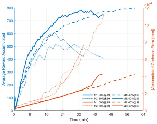 Figure 5 shows the accumulated reward over time obtained by the agent during cycling sessions based on different exploratory rates and the accumulated absolute value of cadence error over time sampled at 10 Hz. It can be seen that the agent is capable of increasing the accumulated reward received by interacting with the environment. However, when the pulse amplitude saturates and the cadence error increases as the controller cannot track the cadence efficiently, the rewards received start to decrease. At this stage, the agent is not able to identify which action is best to implement anymore. During the session “M1: P1 + RL: 60%;@.99“ the application closed unexpectedly, however, without affecting the interpretation of the data. The session duration seems to be shorter compared to Table 1 due to the eventual loss of packets between the mobile and the stimulation system.