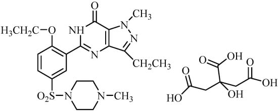 Viagra is an anti-impotence drug with an active ingredient, sildenafil citrate (SC, vitamin V), and its own chemical nomenclature is 1-[4-ethoxy-3-(6,7-dihydro-1-methyl-7-oxo-3-propyl-1H-pyrazolo-[4,3-d] pyrimidin-5-yl) phenyl sulphonyl]-4-methylpiperazine citrate, Figure 1 [1,2]. Physiologically, the erection of the penis is caused by the release of nitric oxide (NO) in the corpus cavernosum, which follows sexual stimulation. Then NO activates a guanylate cyclase that increases the levels of cyclic guanosine monophosphate (cGMP), potentates smooth muscle relaxation in the corpus cavernosum, and is accompanied by the inflow of blood [3]. However, SC has no direct relaxant effect on the isolated human corpus cavernosum but potentiates the effect of NO, after inhibiting phosphodiesterase type 5 (PDE5), which is the responsible enzyme for the degradation of cGMP in the corpus cavernosum [4,5]. SC is used daily with a maximum dose of 100 mg for all categories of patients’ inabilities, whatever the causes of their erectile dysfunction. The elderly, those with hepatic or renal impairments, and/or those receiving cytochrome P450 enzyme CYP3A4 inhibitors could be treated with SC as well [6]. Moreover, the efficacy of SC is a dose-related improvement in the form of its biological duration of erections and hardness and the frequency of the patient’s abilities.