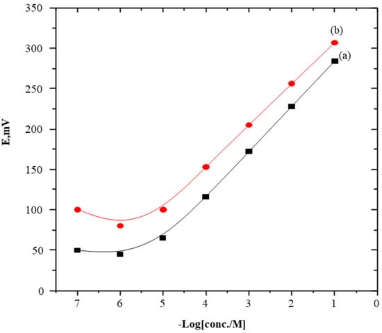The general working characteristics of the electrodes were evaluated by performing regular calibrations in SC solutions, as in Figure 2. Moreover, Table 1 shows the performed preliminary studies on the influence of a plasticizer choice as it affects electrode performances. However, the results of the determinations of the SC-TPB or SC-PTA plasticized with O-NPOE were compared with those obtained in the case of DOP, and their performance characteristics were evaluated according to the IUPAC recommendations [23,24,25,26]. Of the two tested plasticizers, O-NPOE shows the highest total potential change. These obtained data were attributed to the high dielectric constant of O-NPOE, and the high extractability of the formed SC-TPB and/or SC-PTA ion-pair complexes into the sensor matrix compared with another plasticizer (ε values are 24 and 5.2 of O-NPOE and DOP, respectively) [27]. Therefore, PVC plasticized with O-NPOE was used for the next experimental studies.