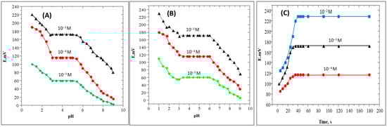 The effect of pH on the SC sensor electrodes containing the SC-TPB and SC-PAT with PVC plasticized with O-NPOE was investigated by measuring the response to 1 × 10−3, 1 × 10−4, and 1 × 10−5 M of SC solutions at pHs that ranged from 1.0–10. The pH is adjusted using HCl and /or NaOH. Figure 3A,B show that the two sensor electrodes exhibited a stable response over the pH range of 3–6 and 3.3–6, respectively, for SC-TPB and SC-PTA sensor electrodes. At lower pH values, the SC contains more than one positive site (nitrogen centers), which increases the potential response and controls the membrane response and stability. However, at the higher pH values, the potential readings for both sensors decreased sharply due to the precipitation or hydrolysis of the measured SC samples. Thus, if the electrode was applied for the determination of SC in samples with a pH higher than 6, the pH of the sample should be adjusted using HCl.