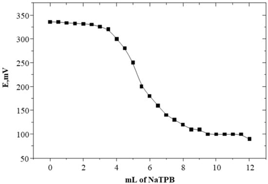 Potentiometric titration of 5.0 mL of 1.0 × 10−2 M of SC solution with 1.0 × 10−2 M of Na-TPB solution using SC-TPB with PVC plasticized with O-NPOE.