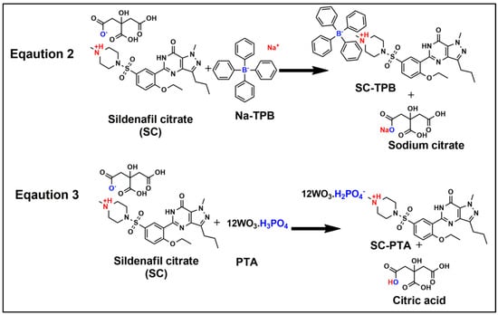 SC-ion pairs using Na-TPB (SC-TPB) or PTA (SC-PTA) were prepared by mixing 50 mL of the target analyte (10−2 M) with 50 mL of any of the Na-TPB and/or PTA reagents, both in a concentration of 10−2 M. The formed complexes’ precipitates were filtered off, thoroughly washed with distilled water, and allowed to dry in the open air.