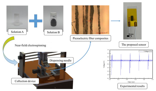 For the PVDF/graphene mixed solution, the procedure was similar to the preparation of the pure PVDF solution, but the required amount of graphene needed to be added into prepared solution B. Since the specific weight of solution A was heavier than that of solution B, solution A was poured into solution B. It was better to mix the solution fully and evenly. Like the pure PVDF preparation of solution, the PVDF/graphene mixed solution was left to stand for 30 min at room temperature to reduce the air bubbles. The experimental procedure for the fabrication of the proposed sensor is shown in Figure 1.