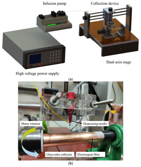 Owing to the disordered and irregularly arranged fiber structures, the further application of the fibers obtained by the traditional electrospinning is limited. Compared with the fibers from the traditional electrospinning, the advantages of the fibers obtained by the near-field electrospinning include the large surface-to-volume ratio, smaller diameter, and aligned dipoles. Furthermore, the near-field electrospinning fabricates fibers at room temperature. Experiments can be conducted conveniently and flexibly. The main experimental equipment of the near-field electrospinning, as shown in Figure 3a,b, includes an XY dual-axis precision control stage, infusion pump, speed-adjustable drum collector, and high-voltage power supply. Supplemented with a copper-foil glass tube for fiber collecting and a replaceable industrial dispensing tip needle, the near-field electrospinning process performs and fibers can be collected.