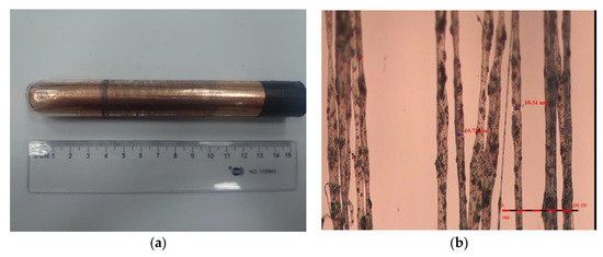 Based on the uniform experimental design method, the experimental parameters were determined. The voltage ranges of the electric field were from 11 kV to 16.5 kV, and the rotational speed of the drum collector was from 400 rpm to 950 rpm. The weight percentage of graphene in the PVDF mixed solution was from 0% to 11%. The type of industrial dispensing needle used in the experiment was 25 G (aperture: 0.261 mm). The distance between the needle and the drum collector was 1 mm, and the movement speed of the dual-axis precision control stage was 2 mm/s. The infusion pump was used to control the propulsion flow rate of the solution at 20 mL/h so that the fibers could be produced smoothly. The fibers of 1 wt% graphene in the PVDF mixed solution were shown in Figure 6a,b for the preliminary test. The results of pure PVDF piezoelectric fibers were obtained as shown in Figure 7a,b, and the PVDF piezoelectric fibers doped with graphene were shown in Figure 8a,b. The electrospinning process continued for 30 min.