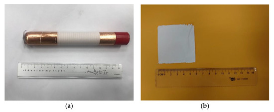 First, the mixed solution was poured into the syringe and put on the infusion pump. The industrial dispensing needle was connected on the other end of the syringe. The positive high-voltage power supply generated a high-voltage electric field as a nozzle for ejecting the electrospinning fibers. The negative pole of the electric field was connected to the adjustable speed drum collector, copper-foil glass tube (the tube wall thickness was 0.5 mm, the outer diameter of the glass tube was 20 mm, and the copper-foil thickness was about 0.10 mm), and a negative high-voltage power supply. When the positive high-voltage power supply was applied to the needle of an industrial dispensing needle and the negative high-voltage power supply was applied to the drum collector simultaneously, a strong electric field was formed between the needle and the copper foil glass tube, causing the solution at the top of the needle to be affected by the additional electric field. When the strength of the electric field reached a value at which the repulsive force between the charges of the polymer solutions overcame the surface tension, the polymer solution in the original hemispherical shape elongated to form a cone, called a Taylor cone [30]. Meanwhile, the industrial dispensing head needle was controlled to move back and forth by the dual-axis precision control stage. The tachometer was used to measure and adjust the speed-adjustable drum collector. Ordered piezoelectric fibers with large area could be collected, and the dipole moments in the fibers showed regular arrangements parallel to the electric field along with the polarization direction. Finally, the packaged sensor, as shown in Figure 4a,b, was prepared with electrodes, polyethylene terephthalate (PET) film, and polyimide PI tapes.