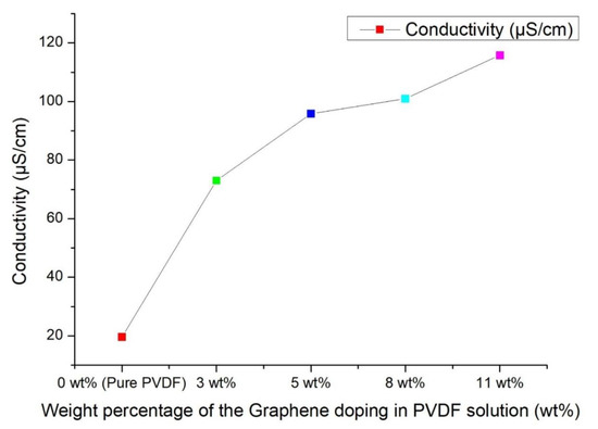 By mixing the graphene powders in the solution, the conductivity of the solution rose. The conductivities of 0 wt%, 3 wt%, 5 wt%, 8 wt% and 11 wt% of PVDF/graphene mixed solution were measured. The results showed that the conductivity of 11 wt% PVDF/graphene mixed solution is 115.3 Μs/cm, which is the highest conductivity among sample solutions. The higher conductivity meant that it was easier to accumulate charges on the droplets, so the droplets broke through the surface tension and formed electrospinning fibers much more easily. Moreover, as shown in Figure 9, the conductivity of PVDF/graphene mixed solution was increased from 19.6 Μs/cm to 115.3 Μs/cm by adding graphene powder. The conductivity of the 11 wt% PVDF/graphene mixed solution increased about five times over that of the pure PVDF solution.