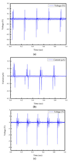 As shown in Figure 5, the sensor was tapped by a rotary beater and connected to the CHI-611D (CH Instruments, Inc., Austin, TX, USA) measuring instrument and the oscilloscope to measure the electrical signals. Since the piezoelectric fibers were deformed when they were beaten by the rotary beater, the piezoelectric response was generated. The CHI-611D measuring instrument was responsible for the measurement of the micro-current generated by the sensor due to tapping.