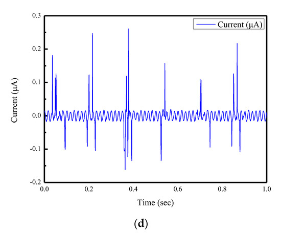 Results of the piezoelectric properties (a) Output voltage of pure PVDF piezoelectric sensor (b) Output current of pure PVDF piezoelectric sensor (c) Output voltage of 7 wt% PVDF/graphene piezoelectric sensor (d) Output current of 7 wt% PVDF/graphene piezoelectric sensor.