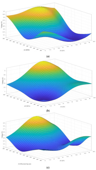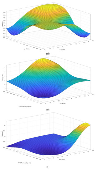 Simulation results of the Kriging model. (a) The relationship between the output voltage of the fiber, applied voltage in electrospinning, and the rotational speed of the drum collector. (b) The relationship between the output voltage of the fiber, applied voltage in electrospinning, and weight percentage of graphene. (c) The relationship between the output voltage of the fiber, applied voltage in electrospinning, and sensor electrode gap. (d) The relationship between the output voltage of the fiber, rotational speed of the drum collector, and weight percentage of graphene. (e) The relationship between the output voltage of the fiber, rotational speed of the drum collector, and sensor electrode gap. (f) The relationship between the output voltage of the fiber, weight percentage of graphene, and sensor electrode gap.