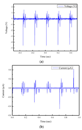 Experimental results of the 5 wt% doping ratio of graphene in PVDF solution. (a) Output voltage. (b) Output current.