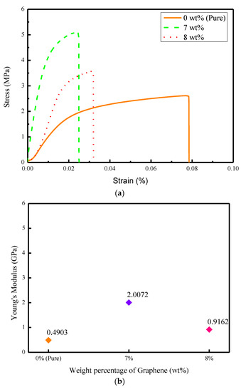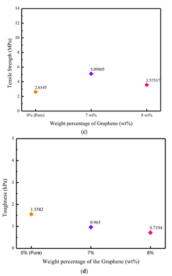 The experimental results of the tensile test (stress-strength curve), Young’s modulus, tensile strength, and toughness test between the pure PVDF fiber, 7 wt%, and 8% wt% PVDF/graphene fibers, are shown in Figure 14a–d. The PVDF/graphene fiber showed better performance in mechanical property tests. It also reflected that the PVDF/graphene fiber had good piezoelectric effect. It could be observed that the tensile strength of pure PVDF fiber was 2.6 MPa, and the tensile strengths of 7 wt% and 8 wt% PVDF/graphene fibers were 5.1 MPa and 3.6 MPa, respectively.