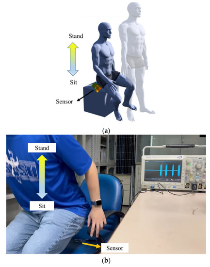 The proposed sensor has potential for motion measurement of the human body and for developing a wearable sensing device. Therefore, preliminary tests of motion intention were performed. For the motion intention test, the sensor was attached to the chair and stand–sit movement cycles continued as shown in Figure 15a,b. Figure 16 shows the output voltages of the sensor. As shown in Figure 17a,b, the sensor was attached to the inner wrist (carpal joint) and wrapped on both sides with tapes. The wrist flexed and extended, and the output voltages were measured as shown in Figure 18.