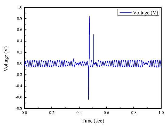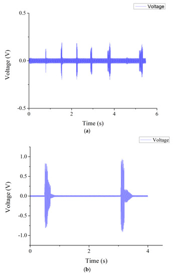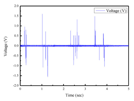 The piezoelectric properties between pure PVDF sensor and PVDF/graphene piezoelectric sensor were discussed. Sensors were tested by tapping tests with a rotary beater. As shown in Figure 10a–d, the maximum output voltage of the pure PVDF piezoelectric sensor was 0.395 V. The 7 wt% PVDF/graphene piezoelectric sensor had the maximum output voltage of all sensors; the output voltage was 3.672 V, which is about 9.3 times that of the pure PVDF sensor. The piezoelectric property of the fibers was improved by increases of the conductivity of the material.