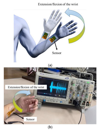 From the experimental results, the maximum output voltage was 1.6 V when measuring the stand–sit movement of the human body. When measuring the extension and flexion of the wrist joint, the maximum voltage was 0.84 V. The experimental results showed that the proposed sensor has advantages of fit, flexibility, and elasticity, making it useful for more complex applications.