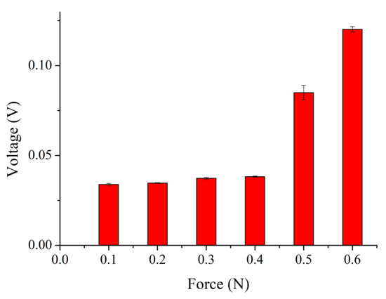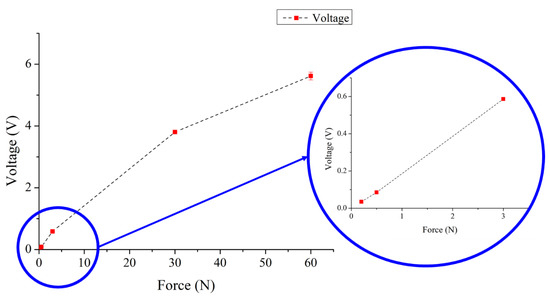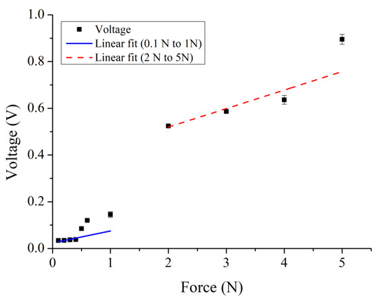 The relationship between the output voltage of the proposed sensor and force was obtained by a force gauge HF-100 (Algol Instrument Co., Ltd., Taoyuan City, Taiwan). The range of the applied force was between 0.2–60 N. The range of corresponding output voltage was 0.03–5.62 V. The relationship between the applied force and the corresponding output voltage is shown in Figure 21. As the applied force was higher, the higher output voltage was achieved. As shown in Figure 22, the resolution of the proposed sensor was 0.1 N within 0.6 N. The range of corresponding output voltage was 0.03–0.12 V. Figure 23 shows the main ranges of linear regression. In the 0.1–1 N range, the sensitivity S = 0.05118 (V/N) and coefficient R2 = 0.14675. In the range 2–5 N, S = 0.07919 (V/N) and R2 = 0.79938. Characteristics of the proposed sensor are listed in Table 7.