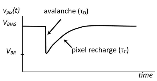 APDs in pixels are biased to a voltage , which is above their reverse breakdown voltage , resulting in a Geiger-like behavior []. The difference is called “overvoltage”, and its value determines many parameters of the SiPM []. An incident photon triggers, with a certain probability, a self-sustaining avalanche breakdown causing a sub-nanosecond rise in the reverse current. After triggering the avalanche, the photodiode represents a relatively small resistance and its reverse voltage decreases rapidly with a time constant . When the voltage reaches approximately the level of , the avalanche ceases and the diode becomes non-conducting again. Then, the pixel node capacitance is recharged through the quenching resistor with a time constant , Figure 2.