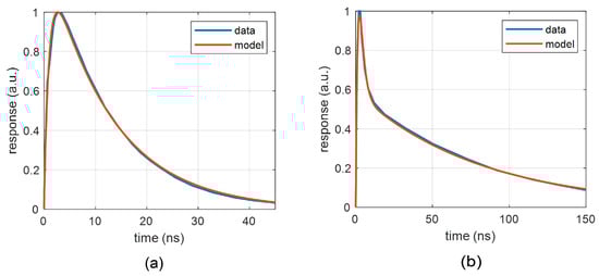 Figure 3 illustrates the use of waveforms (1) and (2) for the normalized responses of two devices from ON Semi, which differ in the fast component. The response of the 10 m-pixel device can be approximated with the double-exponential function (1). However, the 35 m-pixel device shows a clear “fast” component in the response, thus the multiple-exponential function (2) should be used. The data for fitting were obtained by means of digitizing reference waveforms from [], where the device was illuminated with a 50 ps laser pulse at 420 nm wavelength. Note that fitting functions (1) or (2) to the measured response represents an approximation of complex dynamics by a system of the second or the fourth order, respectively. The measurement of nanosecond pulses requires a careful design of laboratory fixtures to avoid wave reflections, which usually appear as overshoots or oscillations on the measured waveforms.