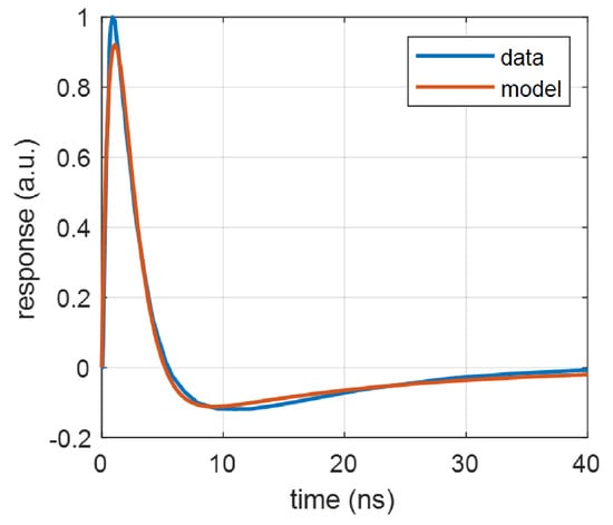 Figure 4 shows fitting the approximation (5) to the output waveform of a 10 m-pixel device ON Semi MICRORB-10010 (Phoenix, AZ, USA). The maximum approximation error at the peak is 8%. Note that the identified parameters and of (5), see Figure 4, differ from those shown in Figure 3 for the same device. The measured waveform on the main output differs from the pixel voltage , and therefore is not a simple high-pass version of . Similar to Figure 3, the reference waveforms were taken from [] for the device illuminated by a 50 ps laser pulse.