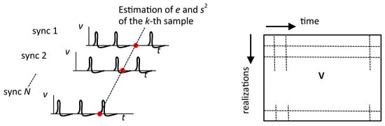where “*” denotes the convolution, and is the pulse waveform, which can be either (2) or (5). However, the subsequent analyses will be performed for the high-pass filtered waveform (5), for which the experimental verification was performed in Section 3. Note that the characteristics (10) and (11) can only be estimated from multiple realizations of the stochastic process , but not from the time series of one realization. Therefore, it is applicable in situations where the process can be periodically restarted, such as ranging applications or probing specimens with periodic laser pulses. It is expected that the pulse period is long enough for all transients to decay. The sampling of in the receiver is started by the synchronization pulse from the transmitter. The pulse transmission repeats and we have multiple realizations, i.e., multiple sampled vectors, of the non-stationary process in the memory, as shown in Figure 6. Then, the statistical parameters of can be estimated from the corresponding samples across the realizations.